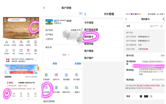 近期有很多老师反映,中国银行提示本人储蓄卡即将到期,如何更换新卡的问题。为确保中国银行储蓄卡正常换卡及使用,并保证银行卡卡号前后一致,各位老师可以通过中国银行手机银行APP预约提交线上换卡申请,20天后携带身份证原件及旧卡到线下银行网点(建议领卡网点:中国银行昆明市世博支行)领卡的方式办理。请各位老师注意查看银行卡到期时间,及时办理到期换卡业务。手机银行换卡具体流程详见《中国银行手机银行自助换卡流程》。
