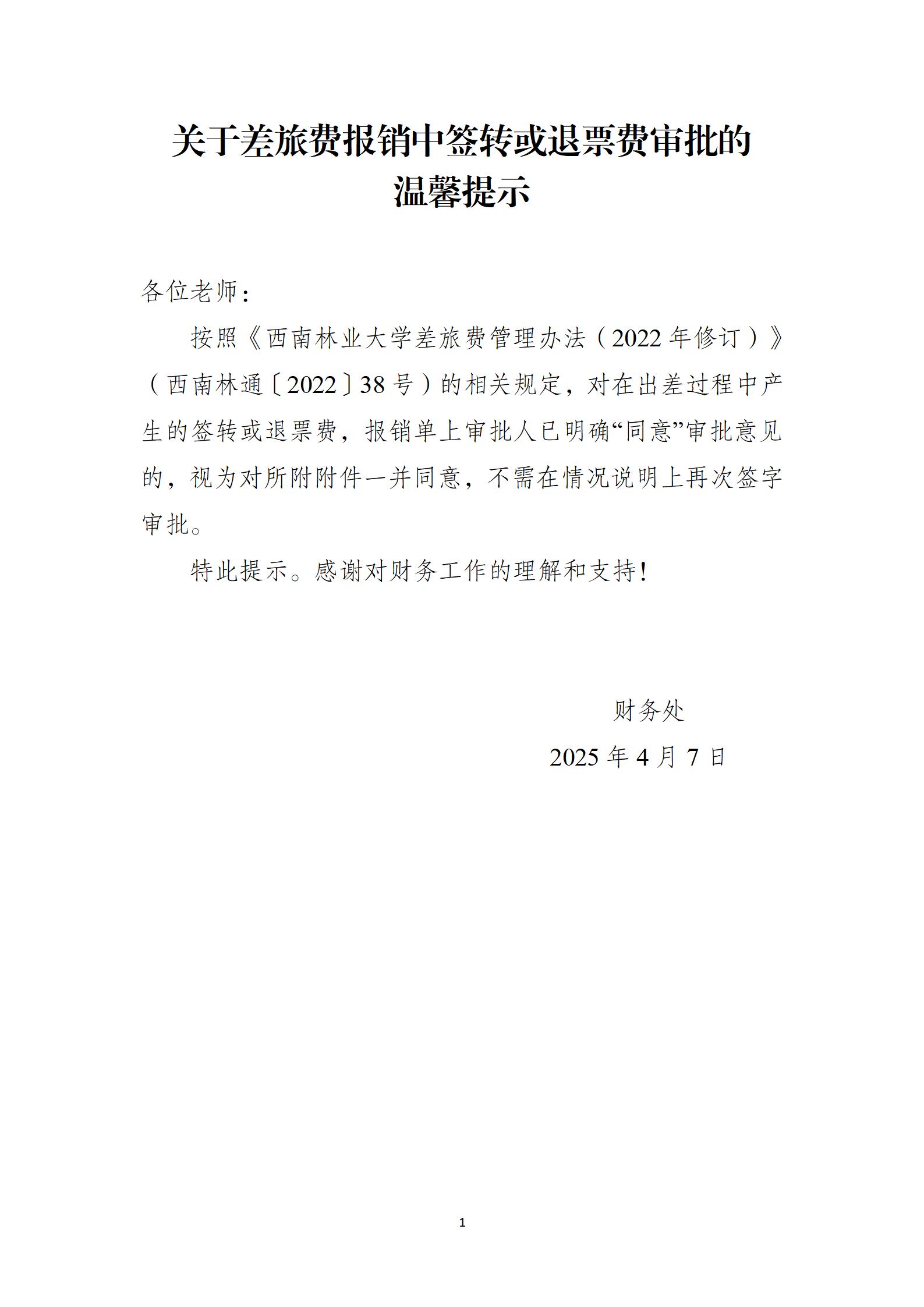 按照《西南林业大学差旅费管理办法(2022年修订)》(西南林通〔2022〕38号)的相关规定,对在出差过程中产生的签转或退票费,报销单上审批人已明确“同意”审批意见的,视为对所附附件一并同意,不需在情况说明上再次签字审批。